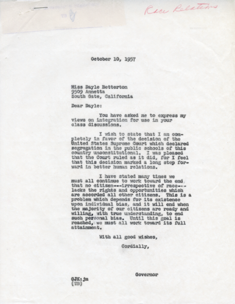 - Letter from California Governor Goodwin Knight to Dayle Betterton about school integration