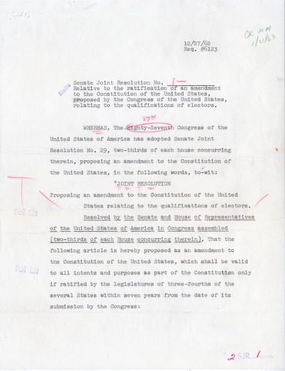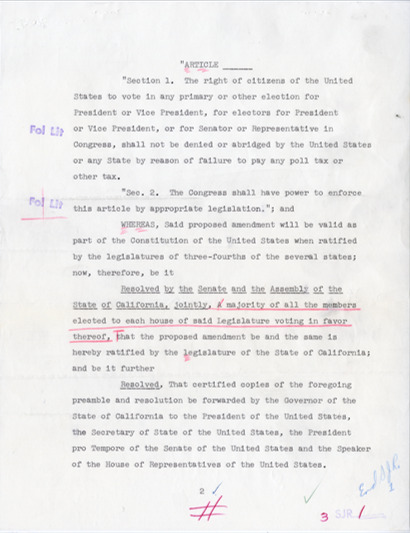 Poll taxes imposed financial burdens on many potential voters and were, in many states, used to disenfranchise Black men and women. California had done away with poll taxes in 1946. In 1963 California became the eighth state to ratify the Twenty-fourth Amendment to the US Constitution upon passage of Senate Joint Resolution 1. This amendment forbade poll taxes in federal elections. In 1966, poll taxes for state and local elections were deemed unconstitutional by the US Supreme Court decision in Harper v. Virginia Board of Elections.