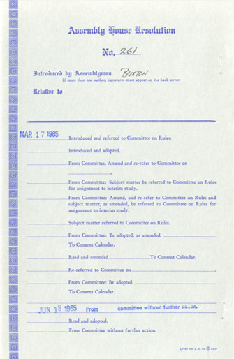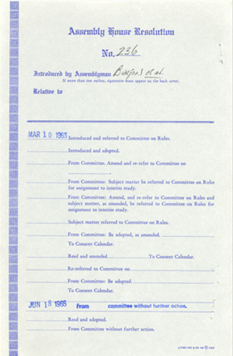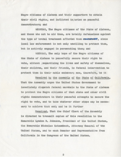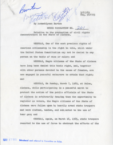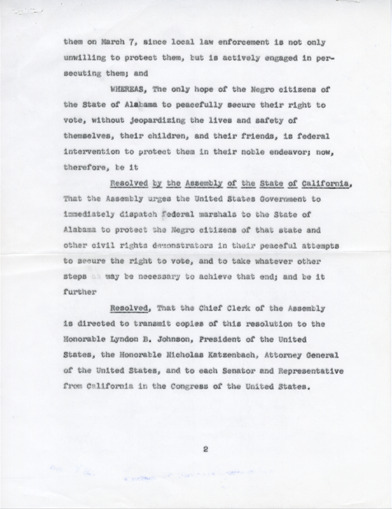 The events of Bloody Sunday compelled California State Assemblyman John Burton to introduce House Resolutions 236 and 261. These resolutions urged federal authorities “to immediately dispatch federal marshals to the State of Alabama to protect the Negro citizens of that state and other civil rights demonstrators in their peaceful attempts to secure the right to vote.” On March 21 a third march was attempted. Freed of the judge’s restraining order and protected by Alabama Nation Guardsmen recently federalized by President Johnson, the marchers succeeded in reaching Montgomery on March 25. In his speech at the Alabama State Capitol, Dr. King stated, “our whole campaign in Alabama has been centered around the right to vote…it is normalcy all over Alabama that prevents the Negro from becoming a registered voter…we will not allow Alabama to return to normalcy."