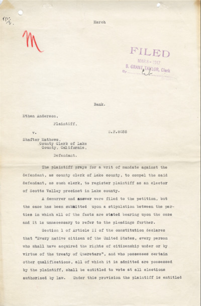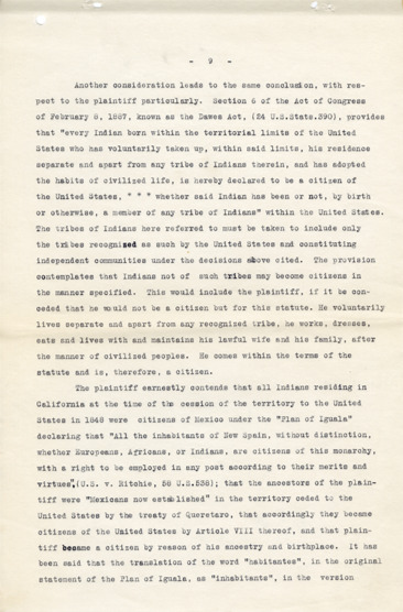 In 1917, Ethan Anderson, a Pomo Indian of California, sued the Lake County Clerk after being denied the right to register to vote on the grounds that he was not a citizen of the United States. Anderson argued that he was a citizen under the treaty of Queretaro (Hidalgo) agreed upon at the conclusion of the Mexican American War which states, “Those who shall prefer to remain in the said territories may either retain the title and rights of Mexican citizens or acquire those of citizens of the United States. But they shall be under the obligation to make their election within one year from the date of the exchange of ratifications of this treaty; and those who shall remain in the said territories after the expiration of that year, without having declared their intention to retain the character of Mexicans, shall be considered to have elected to become citizens of the United States”. Given that Anderson’s ancestors remained in California after the treaty and he himself was born in California he asserted that he was a citizen of the United States.