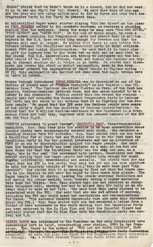 Charlotta Spears Bass (circa 1880-1969) was the first Black woman to run for vice president of the United States and one of the first Black women to operate a newspaper in the country. Bass moved to Los Angeles from the east coast in the early twentieth century and began working for a local Black newspaper called The Eagle. In 1912 she purchased the newspaper, renamed it The California Eagle, and built it into the West Coast’s biggest Black newspaper with a circulation of 60,000. Bass’ progressive politics eventually attracted the attention of investigators from both the FBI and the State Legislature’s California Un-American Activities Committee (CUAC). Investigators from CUAC filed a report about a rally held by the Independent Progressive Party in Culver City on August 27, 1952. It states that “…Mrs. Bass…received a standing ovation from the audience…she condemned both parties, Republican and Democratic stating that the Negro people had waited long enough for equal rights; politically, economically and socially…she stated that it is amazing to find out that the Negro people in Los Angeles do not have the right to live where they please. The Negro people live in shacks, lacking the proper everyday facilities and not having the proper medical care, thereby having a higher mortality rate than the Whites. Mrs. Bass stated that she had received an anonymous telephone call, warning her not to attend this IPP Rally or an attempt would be made on her life. She said that this party claimed to be affiliated with the FBI. She said that she was not afraid of anybody, including the FBI and would speak her convictions…” Bass ran on the Independent Progressive Party ticket as running mate to Vincent Hallinan in that year’s Presidential election. Hallinan and Bass won more than 24,000 votes in California and 140,000 votes nationwide.